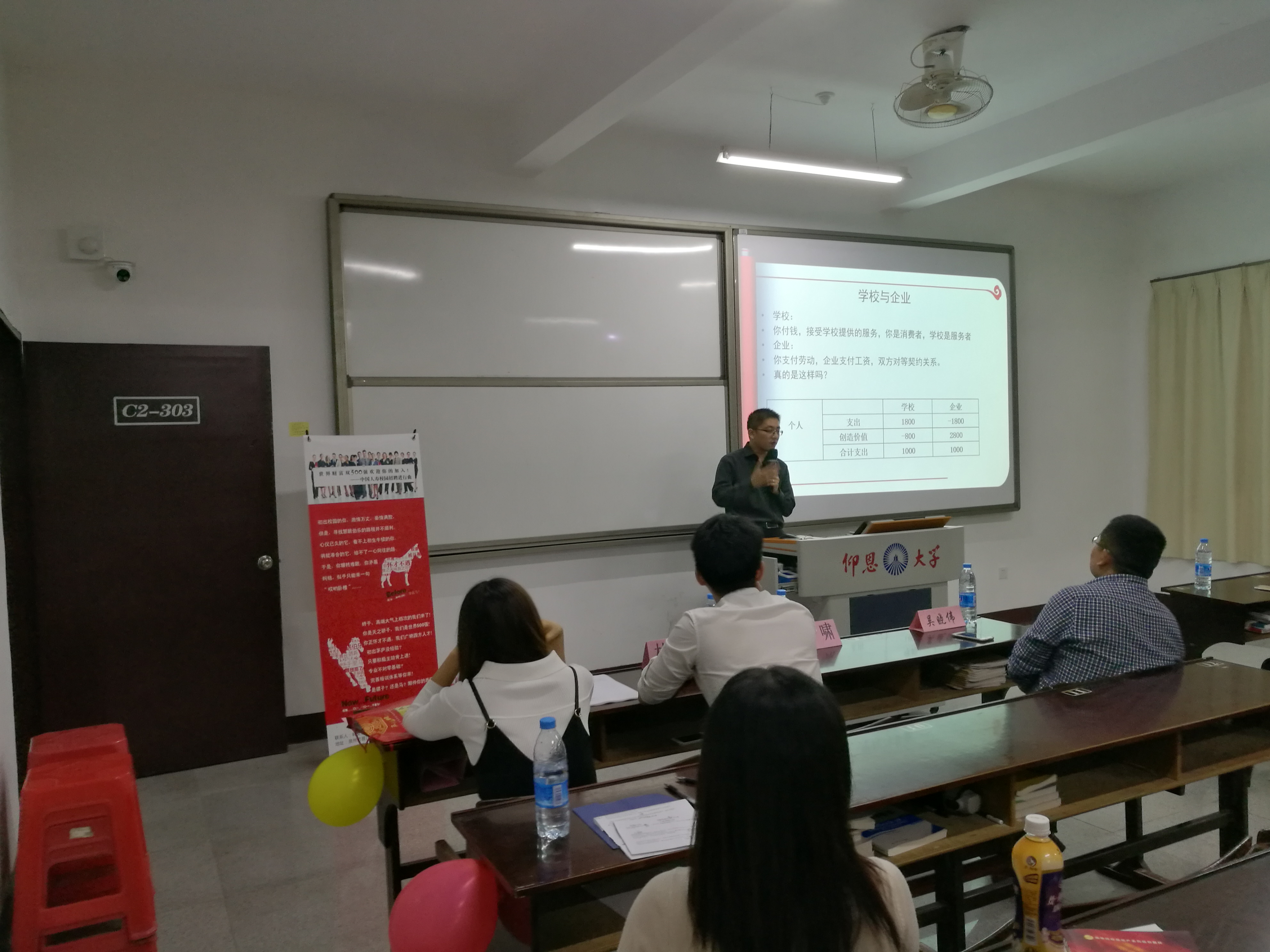 11月1日晚上,买球官方网站于仰恩楼C2-303室举办了中国人寿保险公司企业宣讲会。买球官方网站党总支书记兼副院长吴晓伟、买球官方网站就业指导工作坊指导老师赖桂全出席。