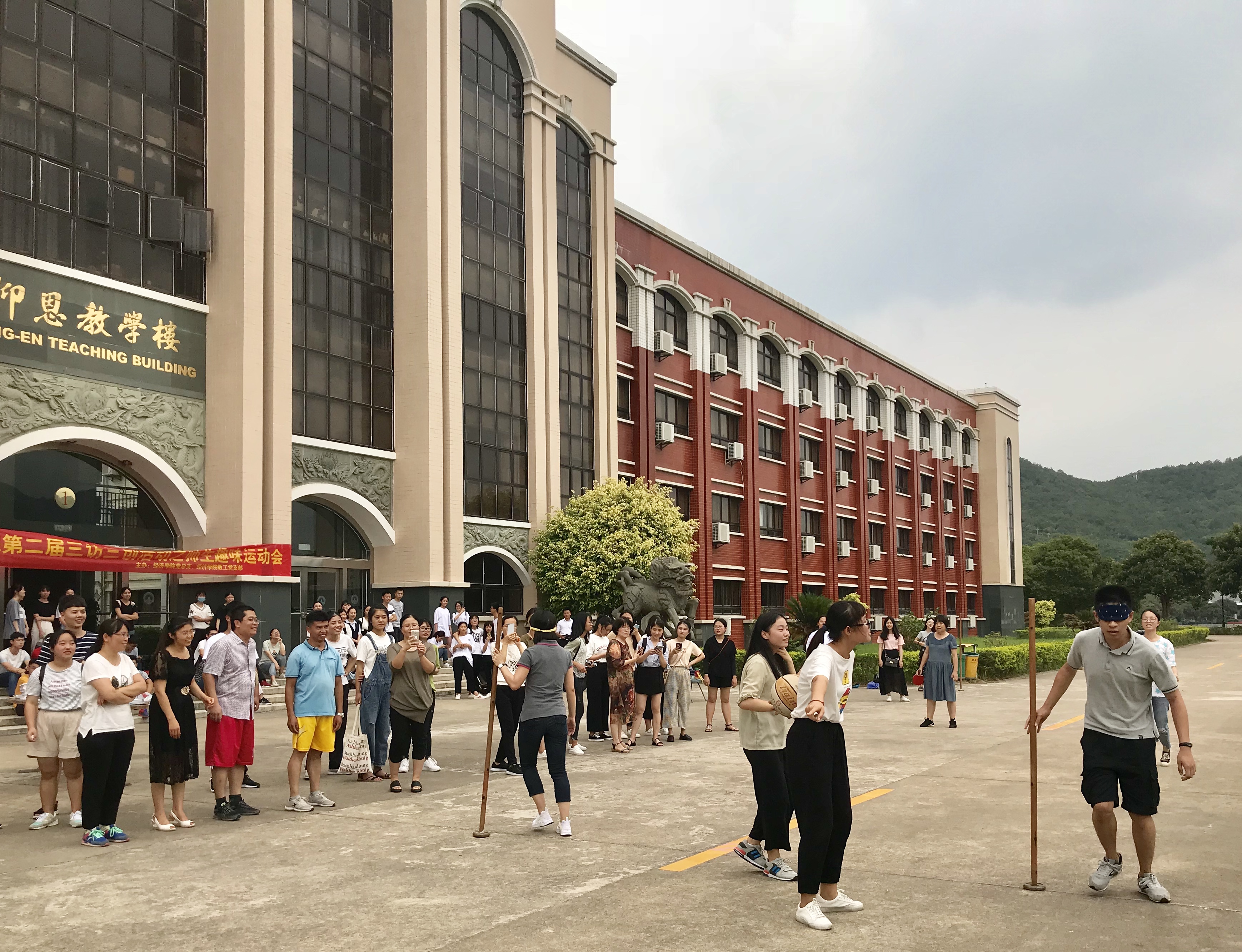 与传统运动会相比,趣味运动会将竞技与娱乐相结合,着重鼓励师生合作参与。为充分体现师生团体精神,本次运动会设置了四个趣味项目:50米迎面接力赛、五人六足、趣味接力赛、穿越呼啦圈。