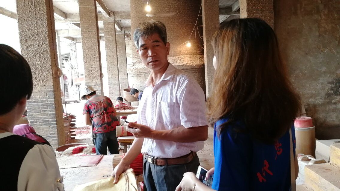(图为香厂负责人介绍永春篾香制作工艺)