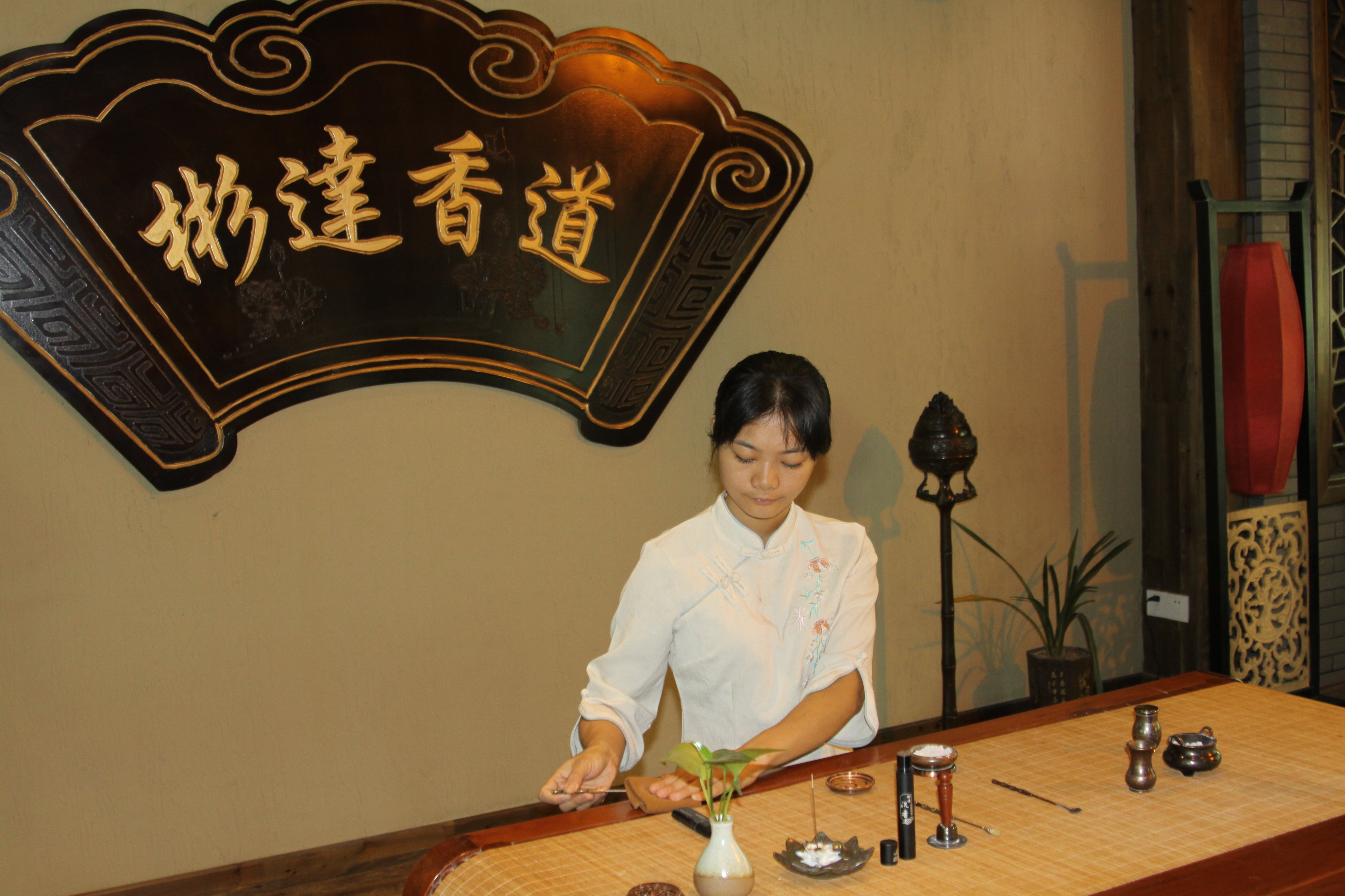 实践队们入座就绪后,表演开始,首先香道表演者给大家展示香道专用工具“君子之器”俗称7君子,接着备火、梳灰之“土”、开炭穴、埋炭、整理灰形等,如此复杂的过程,该公司香道表演者用娴熟的技艺一气呵成,令实践队员们惊叹不已。表演结束后,为了更了解香道表演,实践队员们自告奋勇体验了一把,香道表演者则在旁指导,使实践队员们在那种久违的仪式感中追慕前贤,感悟今天。观看香道表演完后,实践队员们被许愿树上的香囊所吸引,该公司员工介绍这是由他们纯手工制作的。香囊又有香袋、荷包之称,是我国古代刺绣文化、农耕文化的产物,包含着古代劳动人民的智慧。实践队员们跃跃欲试,在征求同意后,实践队员们纷纷动手,自己制作,从中能够了解香文化,并感受香文化的艺术魅力和自己动手的成就感。