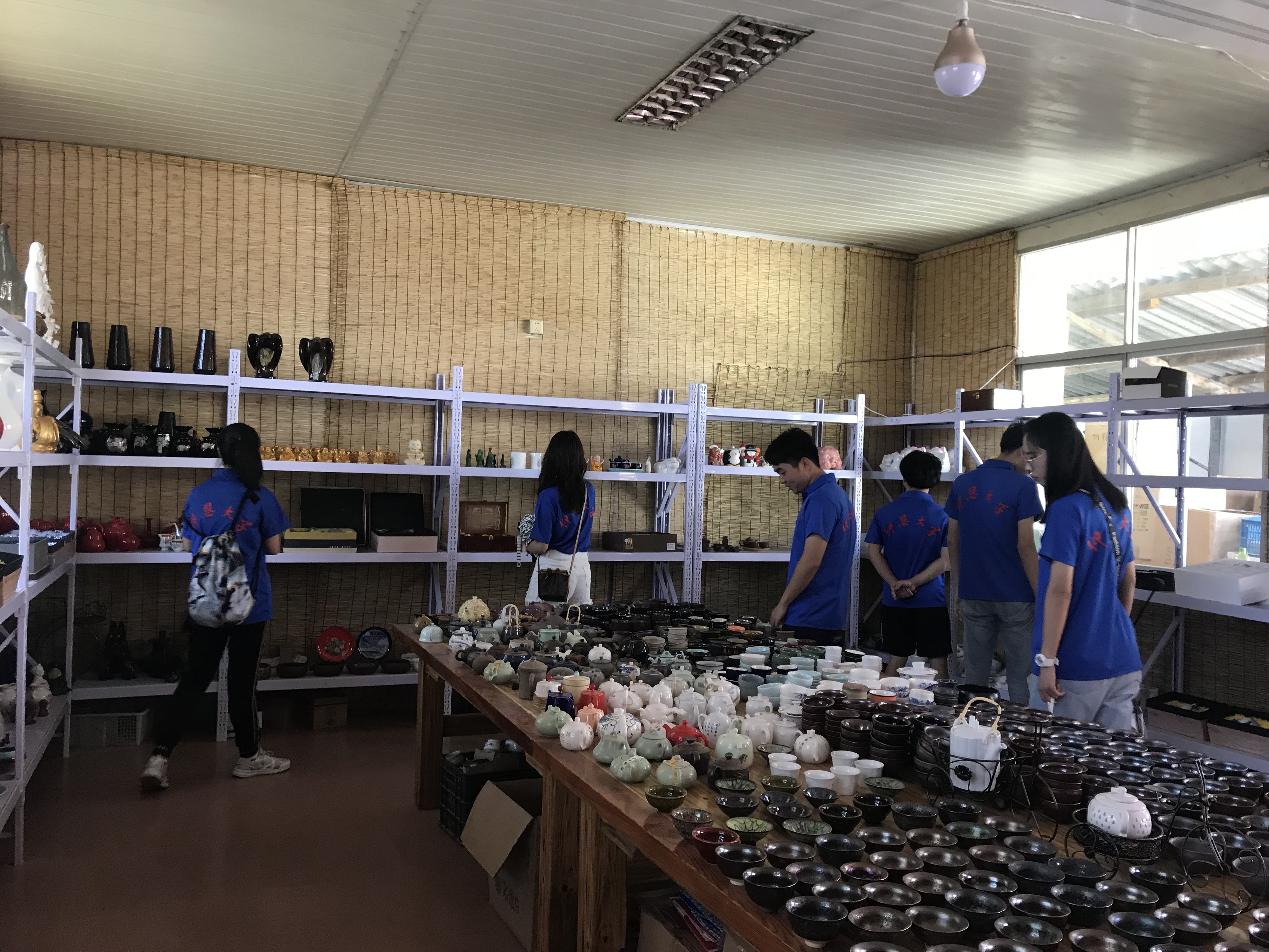 首先,队员们来到了古龙窑,了解到古龙窑(月记窑)以柴烧、传统手工制作为主,结合当代国际陶瓷艺术创作、交流、展示等陶瓷文化活动为载体,并以开发陶瓷文化旅游为主体,吸引了一大批国际陶瓷大师、国际友人等来此创作。随后,花儿与少年们走向了传统手工区,观看老一辈手艺人为陶瓷施釉,手艺人向实践队介绍到施釉分为有生坯施釉法和素坯施釉法,根据不同产品及坯件大小、薄厚和釉料性能,采用浸釉、浇釉、刷釉、喷釉。实践队观察到这里手工制作的精美陶艺作品数不胜数,有造型各异的瓷瓶,也有神采奕奕的陶制人物,还有栩栩如生的动物,令人流连忘返。