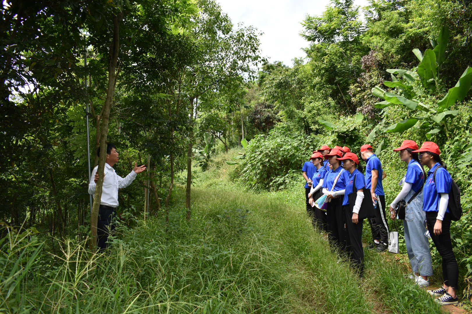 (图为戴场长为队员们介绍珍贵树种)