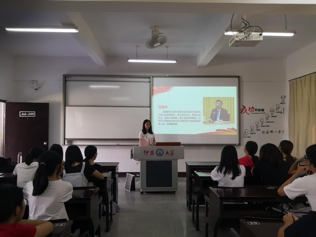 9月23日到24日, 金融系学生第二党支部于在仰恩楼A4-105教室开展了“践行初心使命”专题学习研讨会,党支部全体党员参与了本次学习会。本次会议以PPT的形式学习理论知识,与会党员上台分享学习心得。