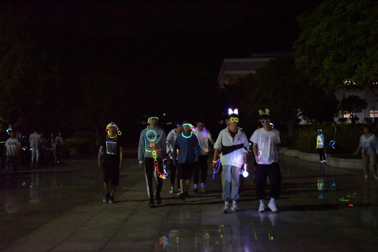 活动共有五个环节,分别是“我是新青年,礼赞新中国”签名活动、荧光环校跑、荧光节目秀、游戏大比拼、荧光创意时装秀。在荧光环校跑环节,同学们佩戴五颜六色的手环,从无字碑广场出环绕图书馆进行荧光跑,展示出了当代青年积极向上的青春活力。在最后的荧光创意时装秀中,同学们利用荧光棒装饰自己并以T台秀形式展示自己的作品,创意迭出精彩纷呈,活动在同学们热烈的欢呼声中落下帷幕。