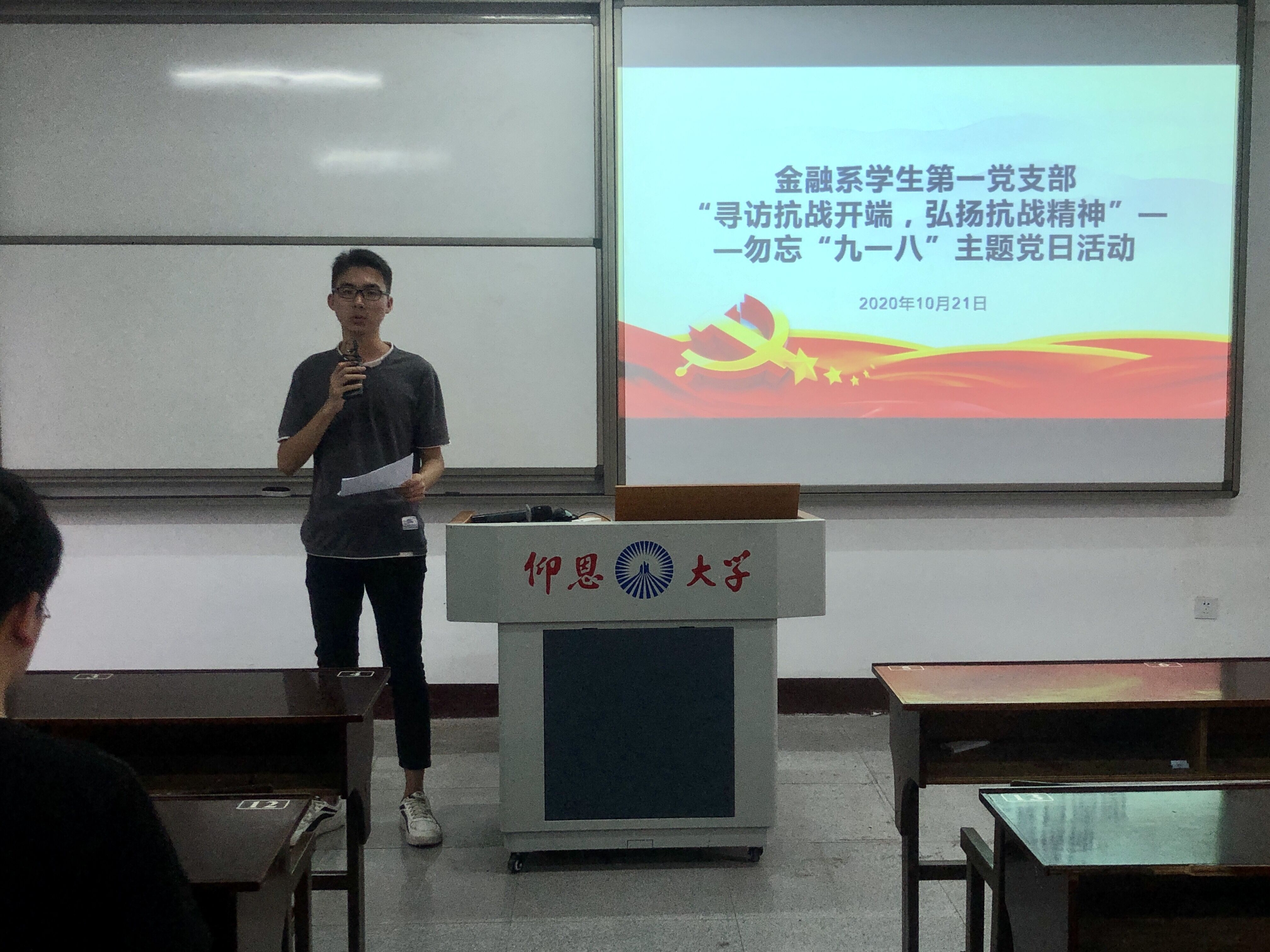 2020年10月21日,买球官方网站金融系学生第一党支部于仰恩楼D2-401开展“寻访抗战开端,弘扬抗战精神”——勿忘“九一八”主题党日活动。本次活动参会人员有支部组织委员何丽玲、支部全体党员和18级、19级各班积极分子代表。