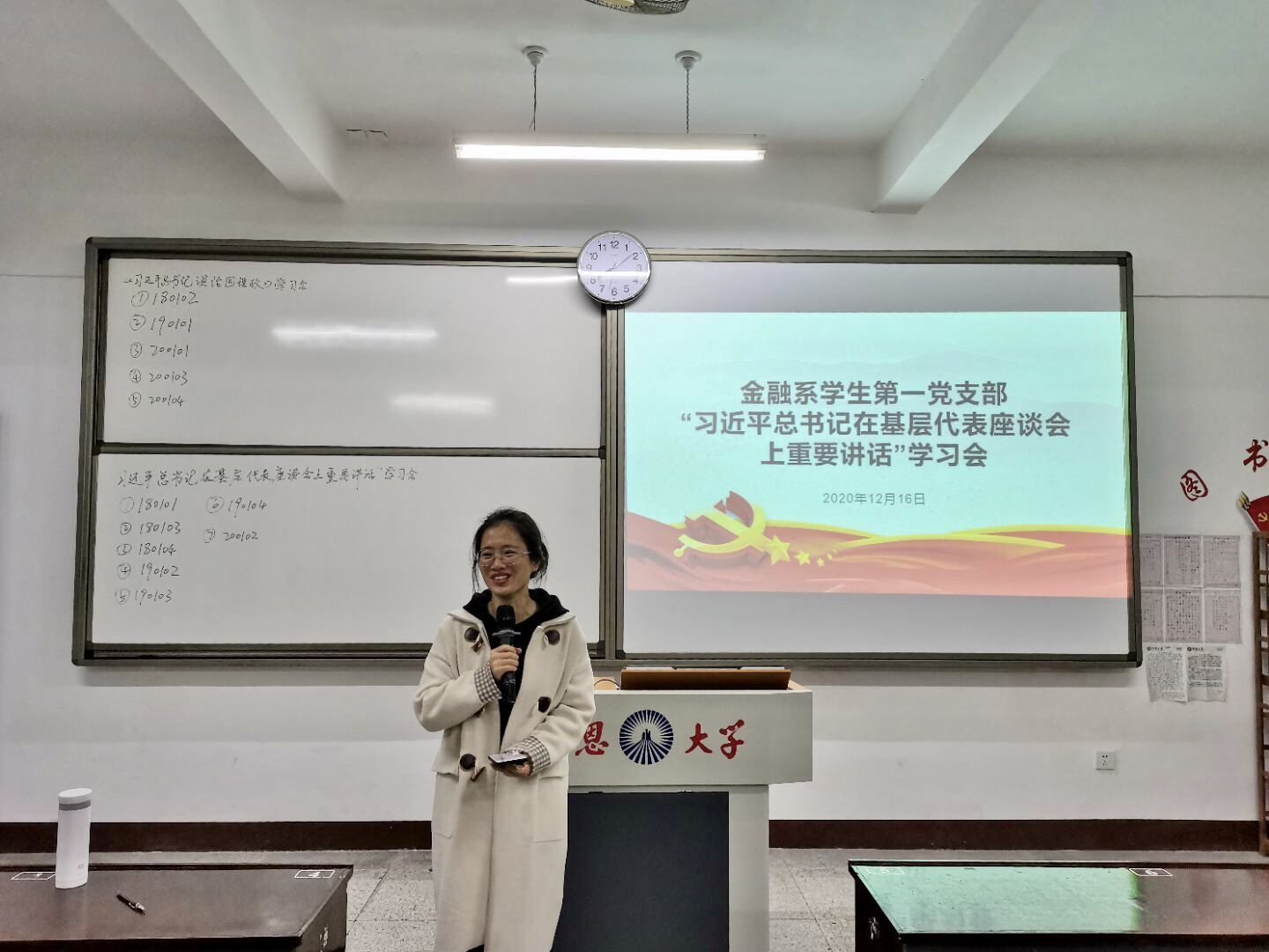 为了深入贯彻学习习近平总书记重要讲话精神,2020年12月16日晚,买球官方网站金融系学生第一党支部于仰恩楼A5-103开展了“习近平总书记在基层代表座谈会上重要讲话”学习会。本次参会人员有金融系第一党支部组织委员何丽玲、支部全体党员以及18级-20级的积极分子。