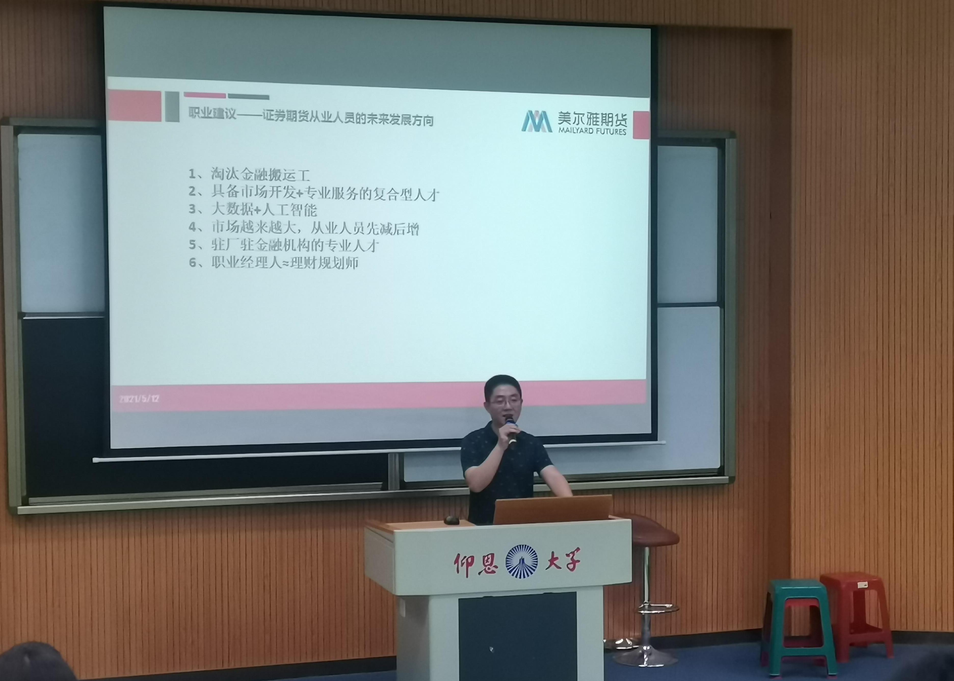 为进一步推进我院学生深入了解期货市场,5月12日下午2点50分,在新区和昌楼思齐大讲堂举办“期货市场分析及期货行业就业前景解读”讲座,讲座由美尔雅期货有限公司泉州营业部总经理、筹建者吴发炜先生主讲。买球官方网站各支部党员、积极分子参加本次讲座。
