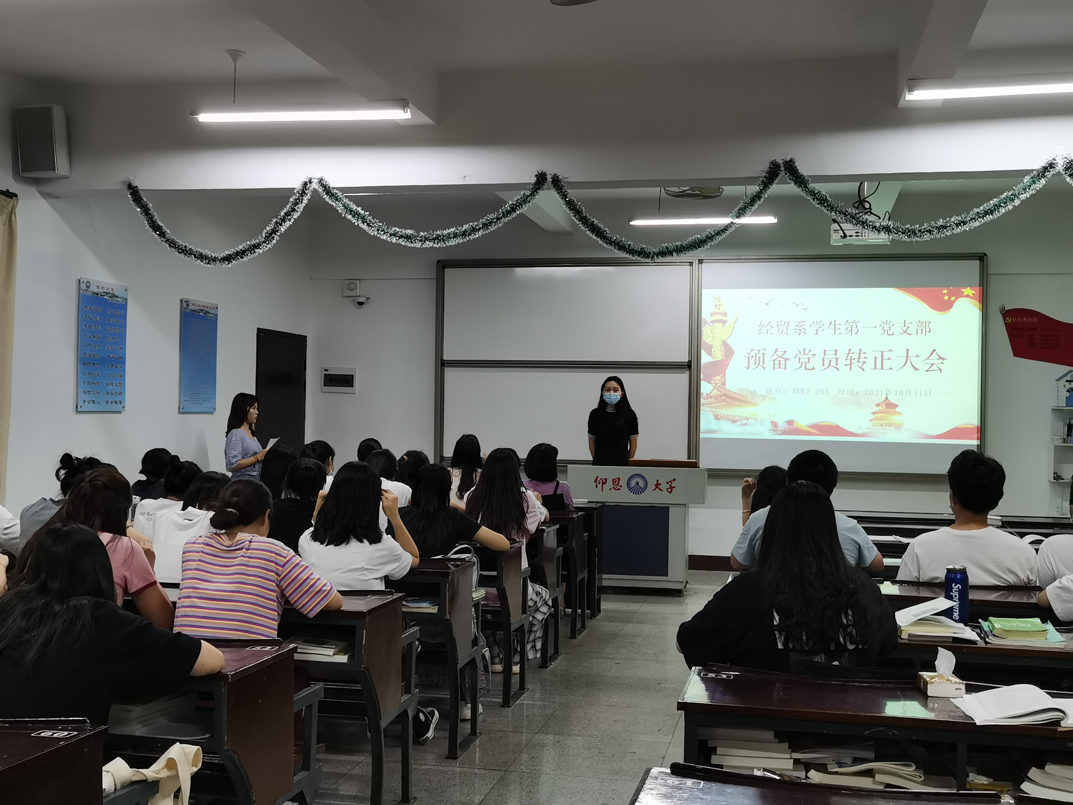 为响应党的号召,培养优秀党员,注入新鲜血液,2021年10月11日晚,买球官方网站经贸系学生第一党支部在仰恩楼B2-205教室召开预备党员转正大会,讨论伍佳音等6名同志的转正问题,支部全体党员同志参加了本次会议。此次会议由党支部书记黄培真主持,并严格按照组织程序进行。