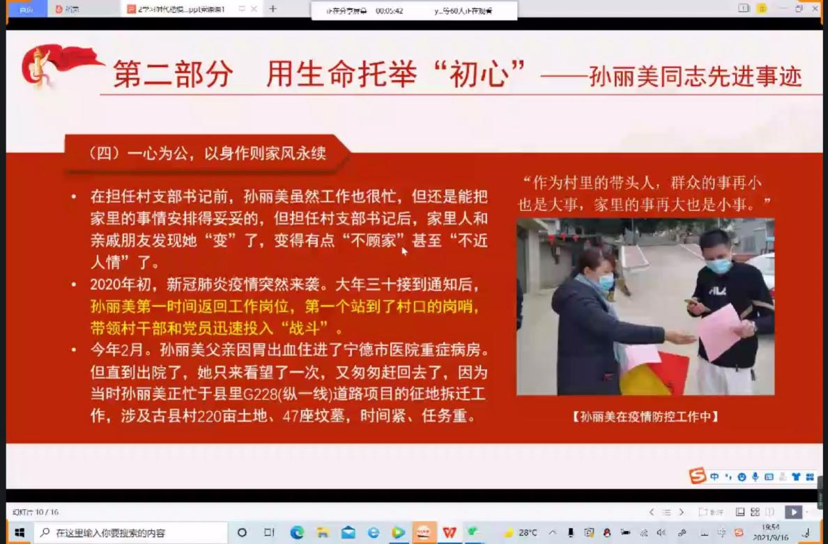 图1 学生党员学习分享情况 活动伊始,各班学生党员代表依次开麦分享,采用屏幕分享PPT,观看相关视频等形式,表达对孙丽美同志的追思和敬佩之情。大家纷纷表示,要像孙丽美同志学习,始终践行党的宗旨,全心全意为人民服务,克己奉公,无私奉献,真心实意为群众办实事、谋福祉。在新时代的征程中奋进有为,努力成为一名勇于担当、主动作为、砥砺前行的党员学生干部。