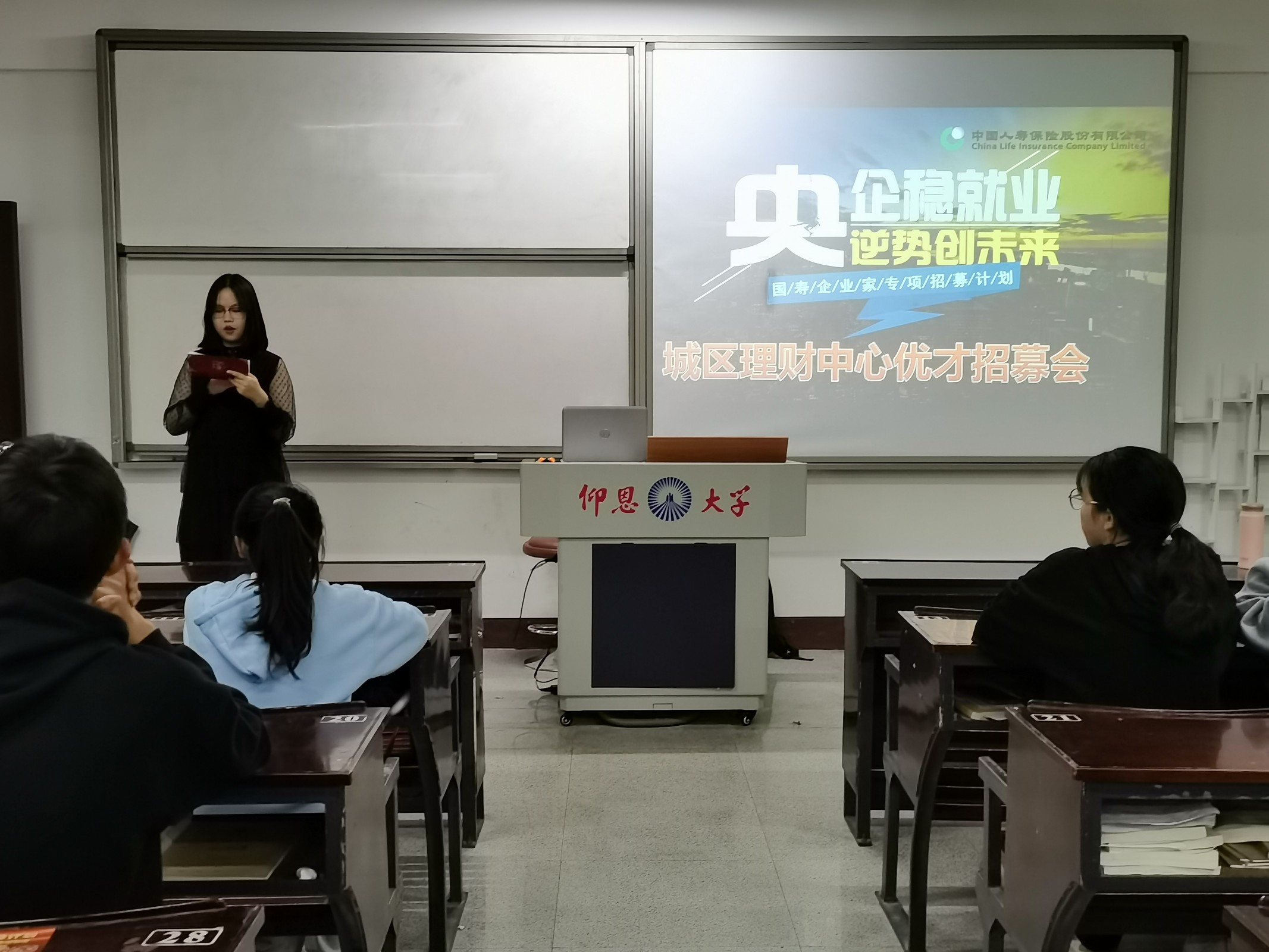 为了更好地拓宽毕业生的就业渠道,缓解高校毕业生的严峻就业形势。由买球官方网站主办,买球官方网站职业发展中心协办的中国人寿城区理财中心宣讲会于2021年11月22日下午四点在仰恩楼A2-101成功举办。参加本次宣讲会的有两名中国人寿公司负责人和买球官方网站学生。