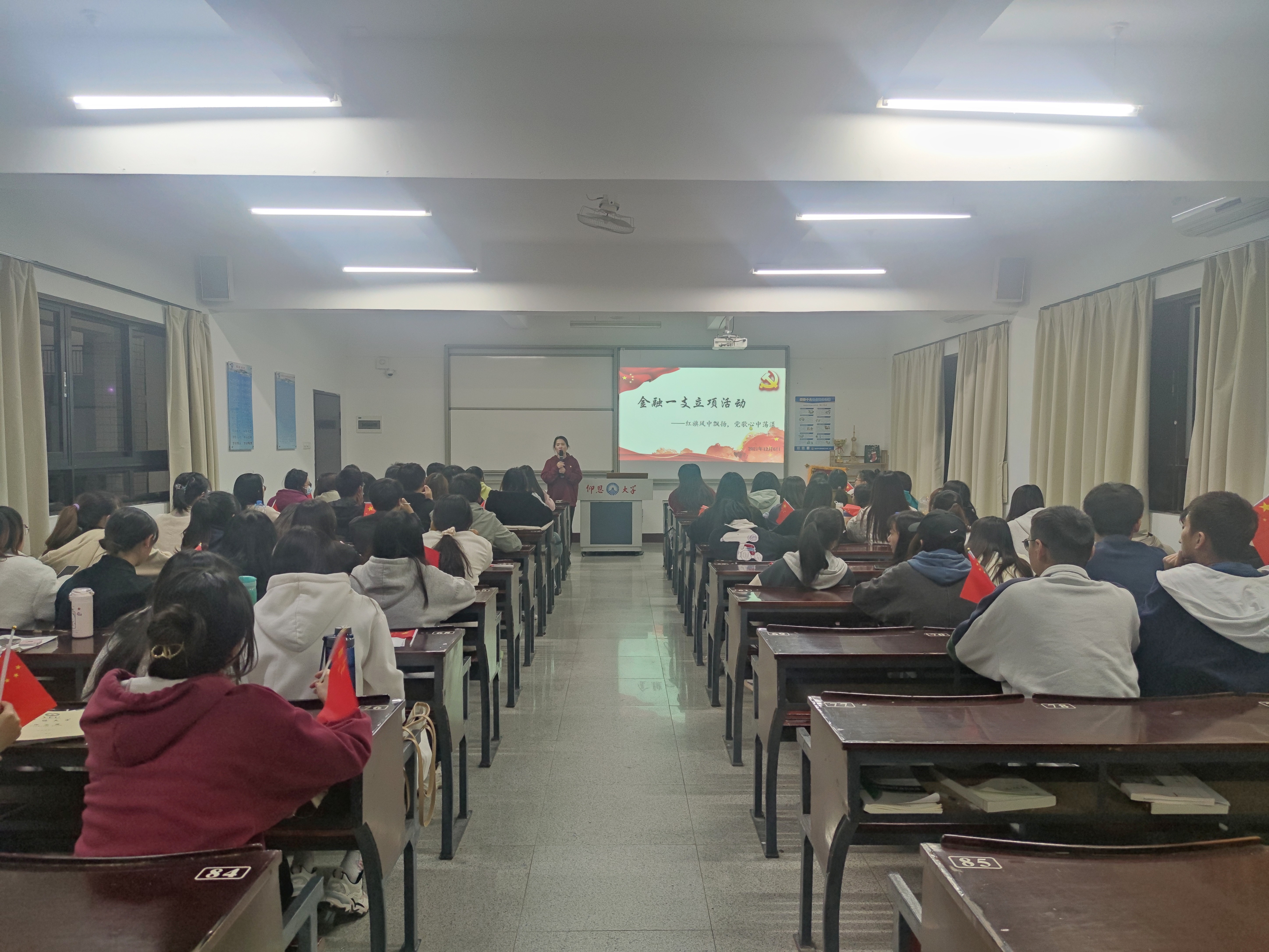 为深入推进党史学习教育,弘扬爱国主义精神,2021年12月6日晚上7:00,买球官方网站金融系学生第一党支部在仰恩楼B5-203开展“红旗风中飘扬,党歌心中荡漾”立项活动,重温党的艰辛历程,传承党的优良品质,弘扬共产党人的精神。此次活动的参与人员有支部书记何丽玲老师,全体党员、发展对象和19、20级积极分子代表。