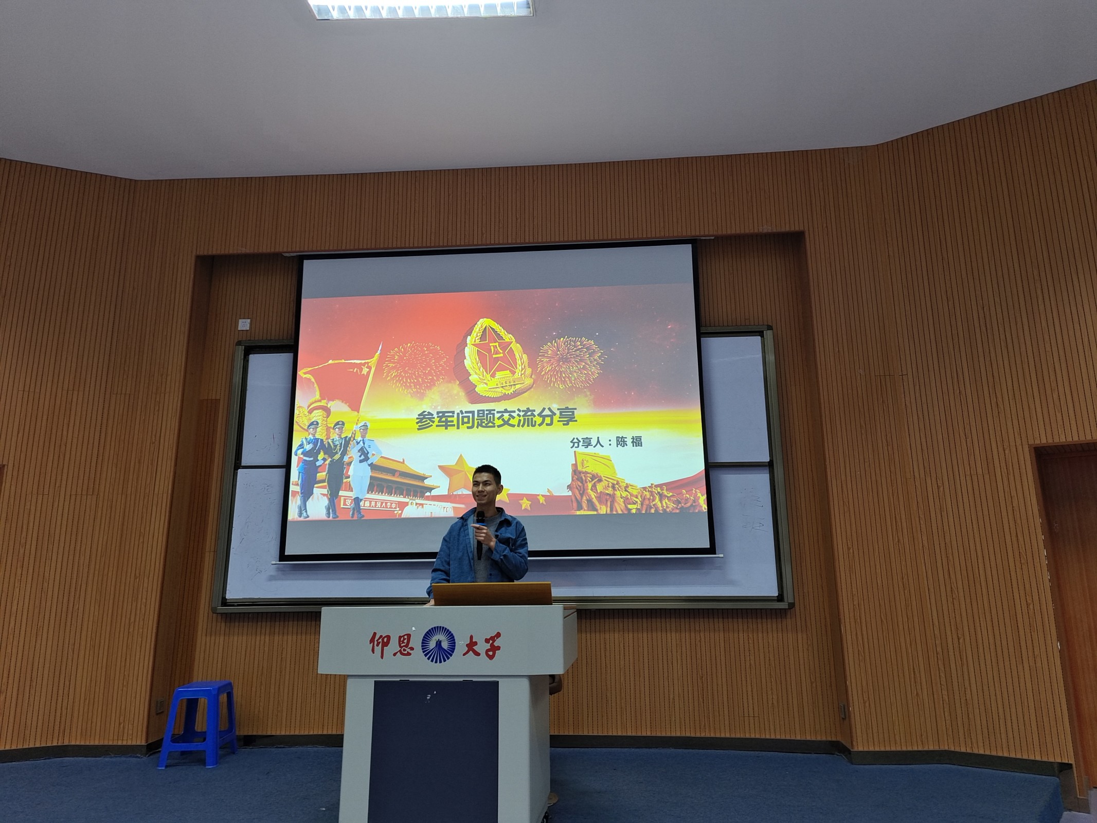 图2 优秀退伍学生陈福同学进行发言 此次征兵入伍宣讲会是学院征兵入伍工作的重要环节,旨在全体学生中营造“青春风华正茂,参军无上光荣”的浓厚氛围,激励更多的有志青年投身军营、献身国防。会后,同学们纷纷表示,参军无上光荣,要不断增强保卫祖国的责任意识与使命担当,多关注国家安全和国防建设、多了解参军入伍政策,争取早日投身军营、建功立业!(买球官方网站党总支/图文 审核:黄培真)