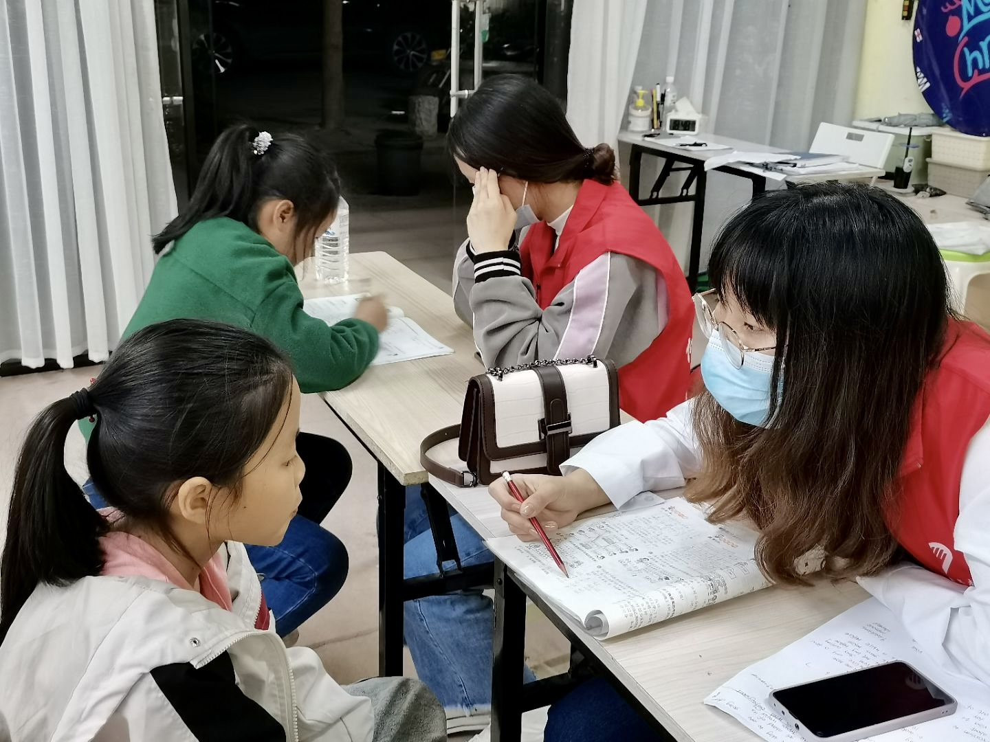 图1 同学讲解题目 此次志愿服务主要内容是辅导小朋友写作业、读绘本以及组织课间小活动。利用晚上课余时间,辅导小朋友完成当天的作业,完成作业之后读绘本和组织做小活动。趣味生动的课间小活动寓教于乐,不仅让小朋友收获了有趣的知识,也让志愿者与小朋友间有了更深入的了解。课间活动期间,大家共同画画,既锻炼了小朋友们的动手能力,也增进了志愿者与小朋友之间的感情。
