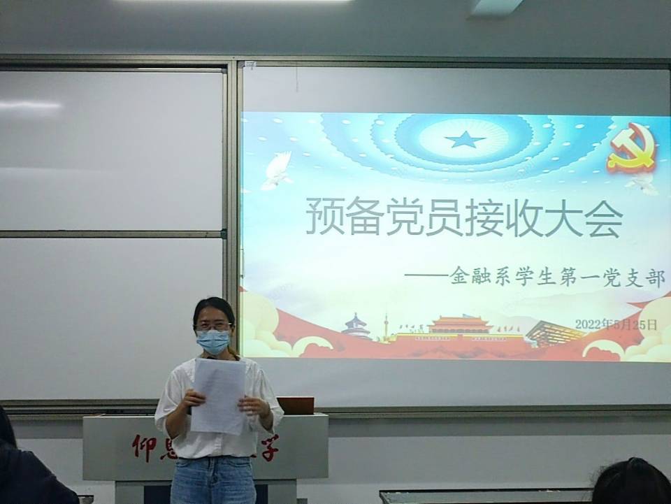2022年5月25日晚上8:30,买球官方网站金融系学生第一党支部在仰恩楼B5-203召开预备党员接收大会。本次会议参会人员有支部书记何丽玲老师、组织委员谢坤宏老师和宣传委员詹奕椿老师,以及支部全体党员,还有即将接收为预备党员的14名发展对象。