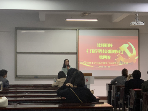 2022年10月21日下午2点20分,买球官方网站教工支部在新区仰恩楼A1-105开展党日活动。在主持人杨娣同志的引导下,刘红艳同志带领大家学习了《习近平谈治国理政》第四卷。