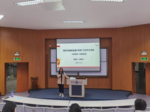 为深入学习贯彻党的二十大,扎实推动学院党建“双创”工作,做好新时代高校党建“双创”工作守正创新,引导学院全体党务工作者深刻领会其中的实质和精髓要义,11月24日,买球官方网站党总支副书记赖桂全老师为买球官方网站全体党务工作者上了一堂生动的专题党课。