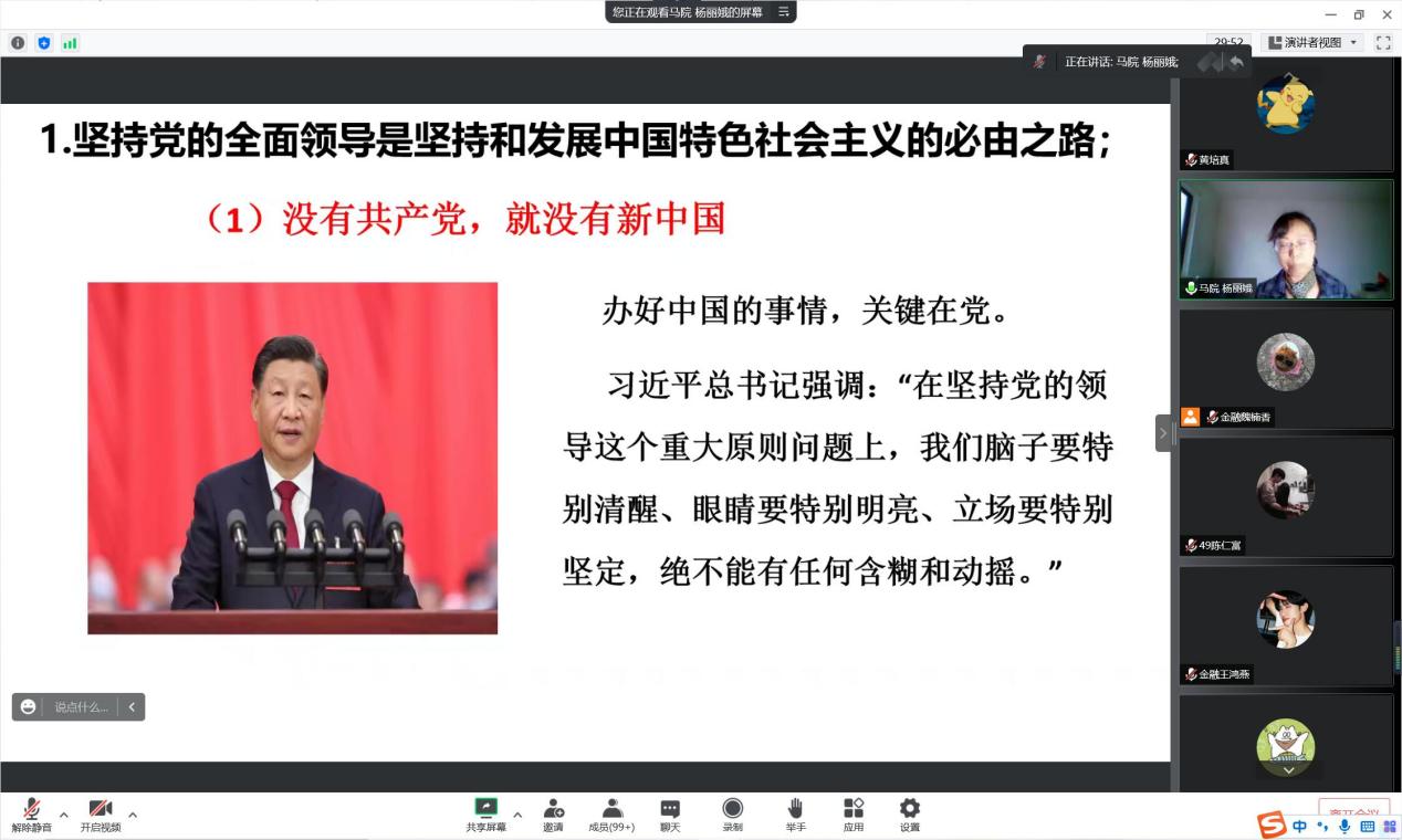 为全面深入学习宣传贯彻党的二十大精神,12月15日下午,买球官方网站党总支特邀我校马克思主义学院杨丽娥老师于线上为我院师生作题为“学习领会党的二十大精神之:准确把握‘五个必由之路’”的专题报告。此次会议由买球官方网站党总支宣传委员黄培真主持。