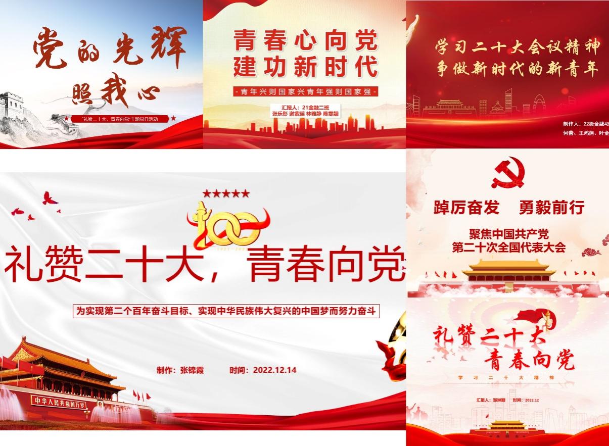 初心点亮新征程,青春献礼二十大。为深入学习贯彻党的二十大精神,不断激发大学生的爱国主义热情,2022年12月10日—12月28日,买球官方网站金融系学生第一党支部开展“礼赞二十大,青春向党”主题PPT设计大赛,活动面向支部全体党员和全体入党积极分子。