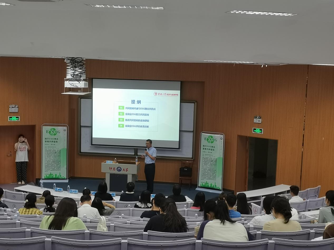 苏梽芳教授从“共同富裕内涵与ESG理念共同点”、“金融业ESG助力共同富裕”、“推进共同富裕的金融逻辑”、“金融业ESG评价体系创新”等四个方面展开此次讲座分享。在此次讲座中,苏教授指出党的二十大报告中提到,“中国式现代化是全体人民共同富裕的现代化”,阐述了共同富裕与ESG理念的基本概念,并介绍其两者的共同点,通过举碳中和和人口老龄化的例子,让与会师生了解共同富裕是社会主义的本质要求,是中国式现代化的重要特征,其核心要义与ESG理念相契合。进而从相似性去探索相关性,提出对ESG理念如何助力共同富裕、金融业ESG如何助力共同富裕的思考,苏教授以浙商银行为例指出,金融业上市公司成为ESG实践领头羊,普惠金融在一定程度上可以理解为是金融层面的共同富裕。并进一步立足于“晋江案例”,分析共同富裕的现实背景及金融逻辑,再次提出对共同富裕的政策思考。最后,提出金融业ESG评价体系的创新发展方向,指出金融助力实现共同富裕的具体努力方向,强调要积极推动新型工业化、能源技术变革与绿色投融资。