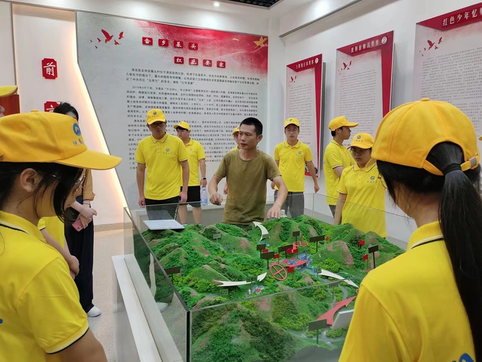 心之所向,步履不停。不久,我们就来到“畲乡基头红色要塞” 的陈列馆近距离感受老一辈给革命英雄留下的红色印记。该陈列室以1930-1935年清流县近代革命历史的发展脉络为主线,以物讲史,通过一件件珍贵文物,一个个历史事件,生动、立体地讲述了基头村畲汉两族人民在中国共产党、中国工农红军的领导下,为争取民族独立解放而进行的可歌可泣的革命故事。其中,最引人注目的就是位于展厅正中央的模拟沙盘,雷委员依托沙盘向实践队队员详细讲述了土地革命时期红军在基头村所经历的艰苦战斗,其中包括红军布局行军路线、敌我双方交战地以及近年来周边地区的发展等,帮助实践队队员更深刻地认识基头村的特殊地理位置对打赢基头村保卫战的重要性。