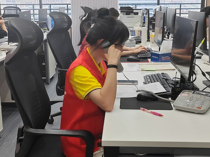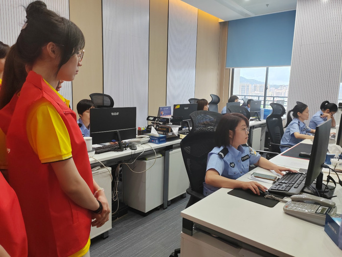 在实践队员跟林警官会面后,林警官随即带领队伍参观反诈中心,熟悉公安在防范诈骗以及发生诈骗时相关部门应如何应对的流程。队员们走进反诈中心的预警处置室,了解了反诈民警日常工作之一的打预警劝阻电话。警官还邀请队员体验充当预警员,向有被诈骗风险的人进行风险劝阻,体验过后方知警员日常工作的辛苦与不容易。在该区域对面,入驻了八家银行的金融防卫室,在这里警员们可以快速查出受害人的银行流水。