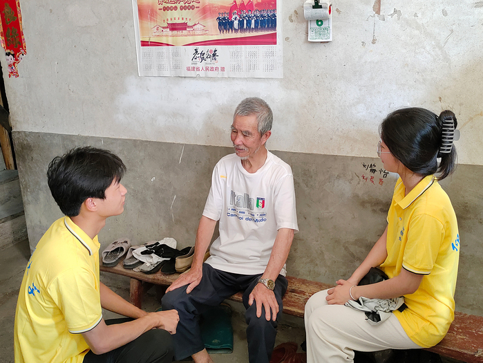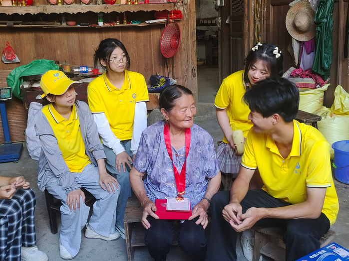 传承红色血脉,赓续在党荣光。为关心老党员身心健康,队员们带上慰问品,在村干部的带领下来到革命老党员的家中对其进行慰问。老党员热情接待了实践队员们并进行了亲切交流,讲述了入党以来的工作经历及感悟,表达了对党的真诚感谢与衷心祝愿。队员们认真聆听,进一步坚定了投身强国伟业的理想信念。