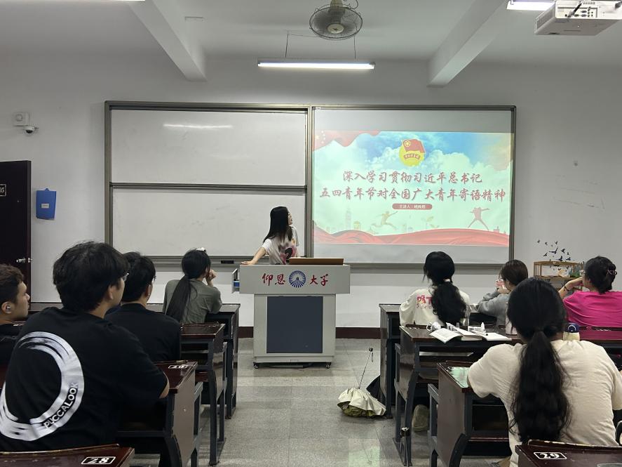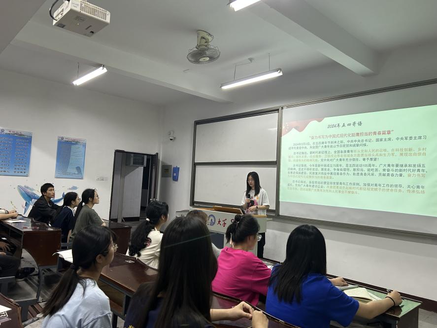 为深入学习宣传贯彻习近平总书记五四青年节对全国广大青年寄语精神,动员引领广大青年把思想统一到习近平总书记重要寄语精神上来,把力量凝聚到习近平总书记提出的各项任务要求上来,奋力书写为中国式现代化挺膺担当的青春篇章,2024年5月27日,买球官方网站团委书记姚姝然开展“深入学习贯彻习近平总书记五四青年节对全国广大青年寄语精神”主题团课微宣讲,23金融1班、23金融2班全体团员参加。