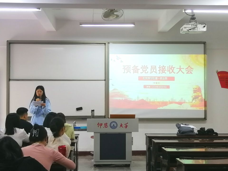 6月3日下午4:25,买球官方网站经贸系学生第一党支部于仰恩楼A3-103组织召开预备党员接收大会。此次会议由支部书记黄培真主持。