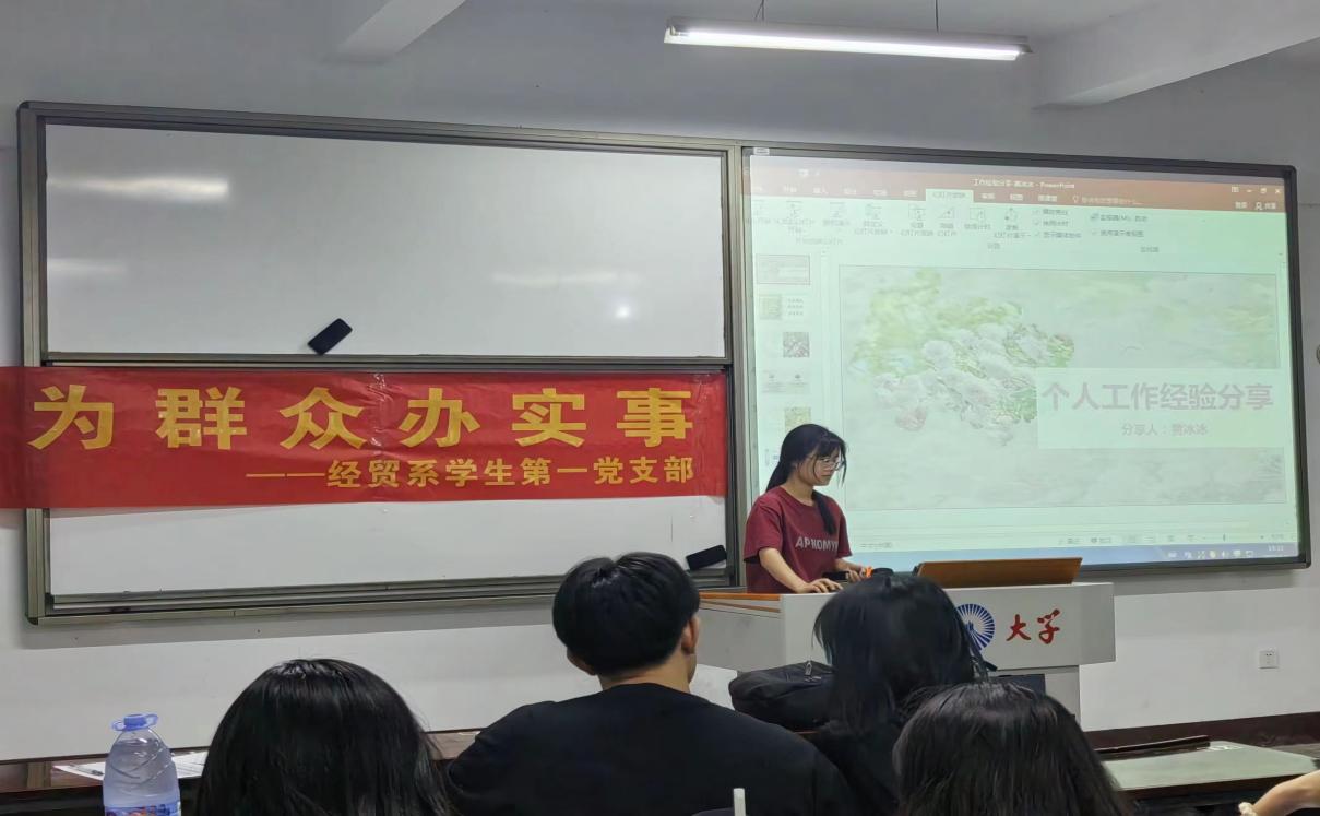 为全面贯彻党的二十大精神,总结经验做法,促进交流借鉴,经贸系学生第一党支部于6月3日晚上7:30在买球官方网站第三教学区仰恩楼A5-105,组织开展“我为群众办实事——学生工作经验分享”活动,邀请黄冰冰、李荣美进行学生工作经验分享,23级全体同学参加本次活动。
