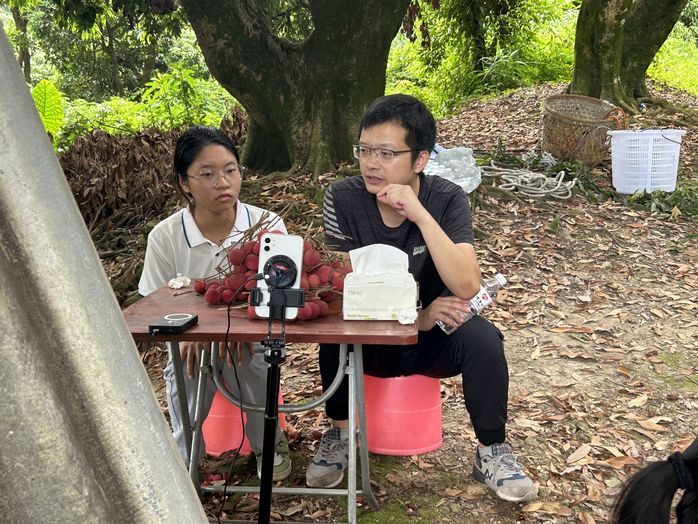 实践队成员们来到了进行直播的荔枝园,开始了直播准备工作。实践队员配合当地果农布置直播场地和调试设备,确保直播过程顺利进行。随着直播的开始,主播为直播间观众们介绍了荔枝的品种、口感和营养价值以及岵山镇种植荔枝的优势。直播中,果农们还现场采摘荔枝,并让实践队员现场品尝。为了增强活动的吸引力,主办方还设置了多个互动环节,包括在线抽奖、优惠促销等,激发观众参与积极性,提高直播的参与度和转化率。这些活动不仅激发了消费者的购买热情,也有效扩大了岵山荔枝的市场影响力。