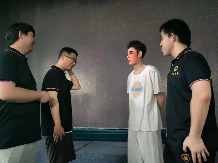 在舞台后场,队员们亲身感受闽剧妆容。闽剧妆容的打造需用油彩,历经打底、上红、扑粉、抹腮红、描眉、画眼线和唇妆等步骤,每一步都彰显传统艺术的精细。耗时近一小时妆造过程,让成员们深切领略到闽剧妆造的独特魅力。