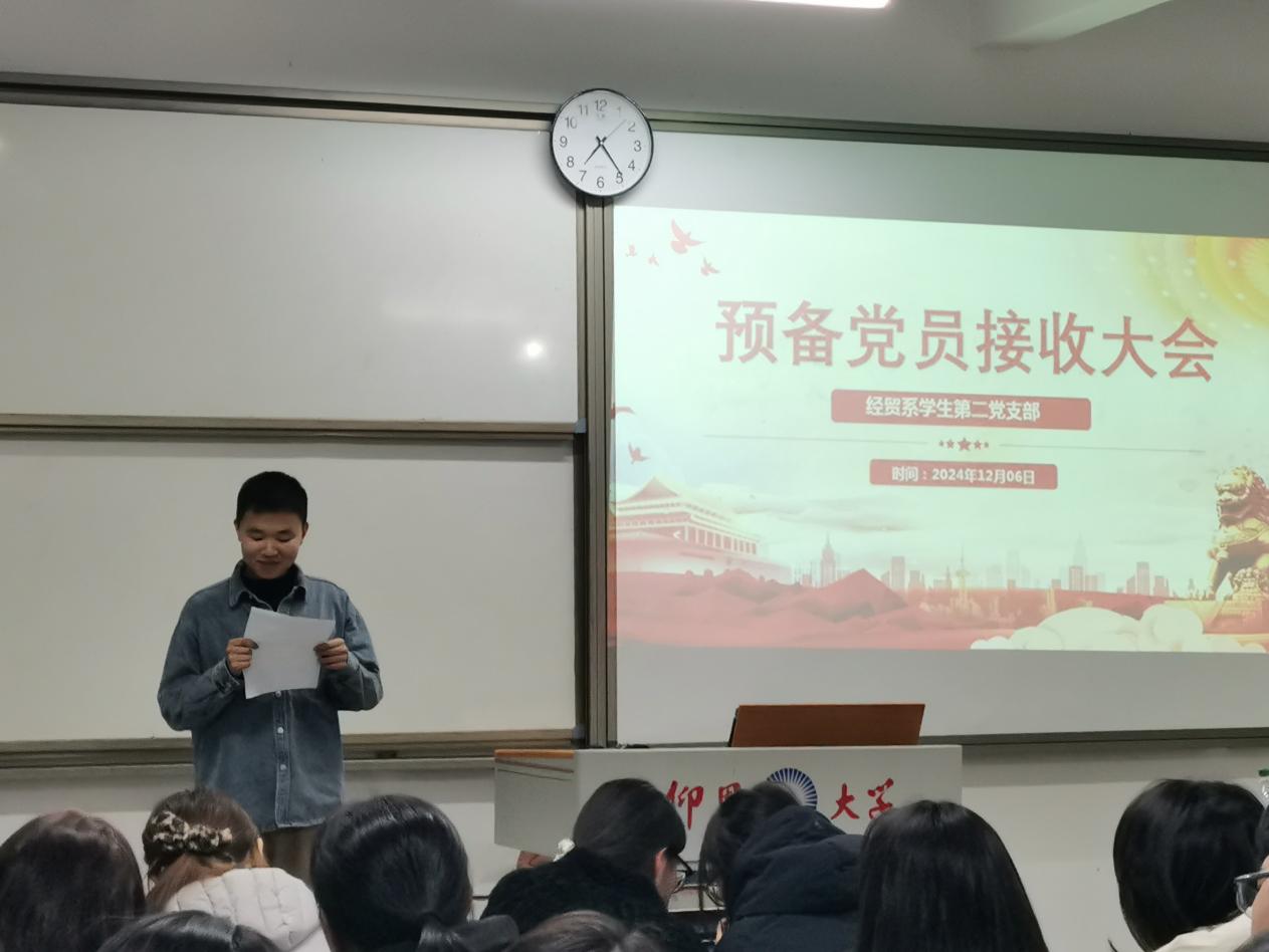 2024年12月06日晚19:00在仰恩楼A1-109,买球官方网站经贸系学生第二党支部召开预备党员接收大会,主要讨论吸收新党员。支部书记李荣美等支部全体15名党员参加了此次接收大会。