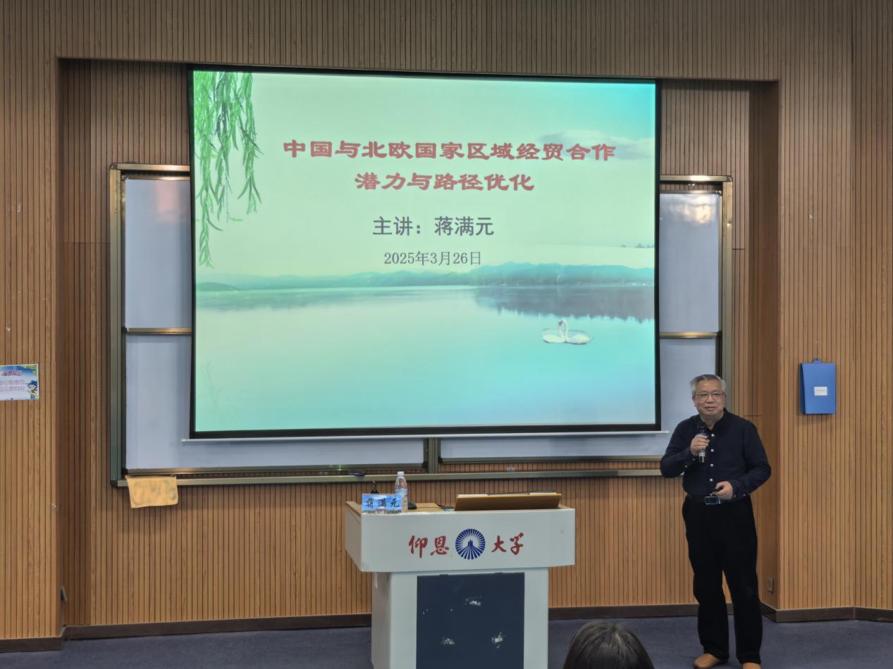3月26日下午,仰恩大讲堂第五十二讲在新区和昌教学楼海纳讲堂顺利举行。本次讲座以《中国与北欧国家区域经贸合作潜力与路径优化》为题,特邀重庆对外经贸学院副校长、经济学博士蒋满元教授担任主讲嘉宾。买球官方网站院长张雪梅出席此次活动。