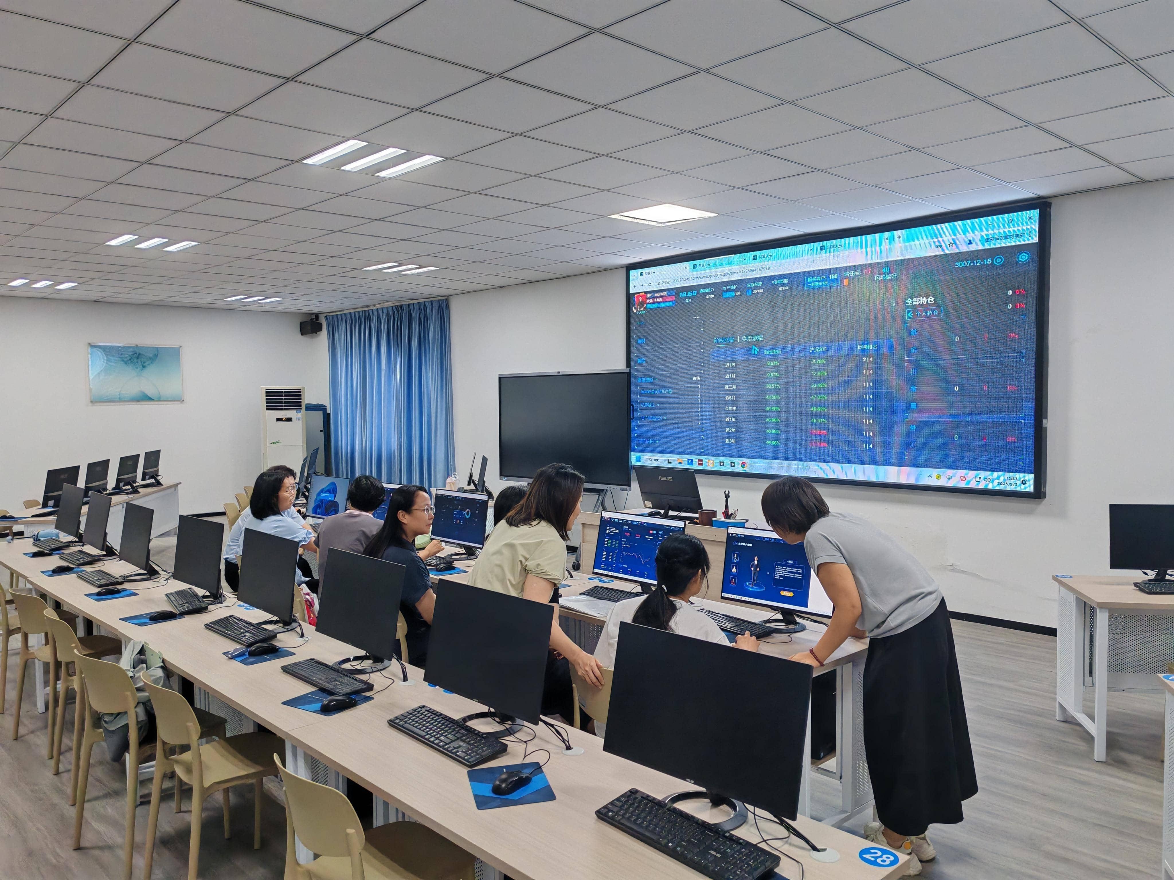 2025年9月3日下午,财政学与金融学系部分教师在普照楼133开展财富人生理财实战沙盘系统培训。该软件将应用于我校特色实训课程《金融投资模拟实践》的实践课时部分教学。金智东博(北京)教育科技股份有限公司高校事业部总经理杜海军从学生端和教师端详细地讲解了该软件的具体应用及操作注意事项。此后还向到训教师演示了该公司最新研发的AI金融营销语音陪练平台和金融智能投顾实训平台。